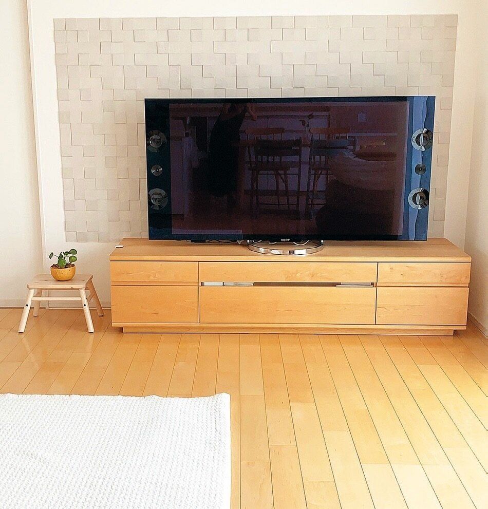 リビングでいちばん視線が集まるのがテレビ台まわり。物を置かないルールを徹底して、部屋全体がスッキリした印象に。引き出し内のDVDやゲームはあふれる前に見直します。