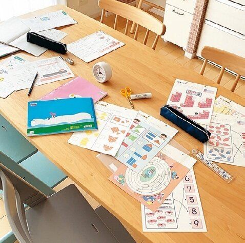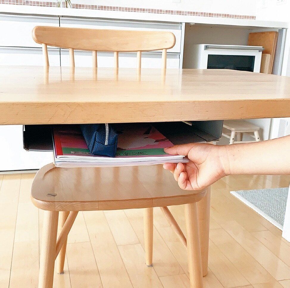 楽天で見つけた紙製の書類ボックスを天板の裏にテープでペタッ。子どもが宿題中でも道具を一時避難できて、夕食前、テーブルの上は”秒”でキレイに!