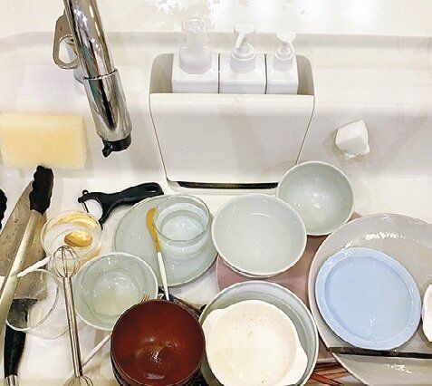 キッチンが片づいていると入浴後の気持ちよさ倍増。「食器は食洗機に入れて、シンク掃除と排水口ネットの交換までやってしまいます」。