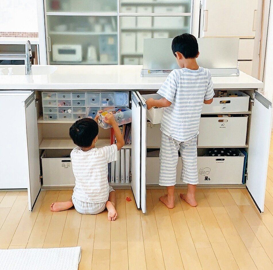 寝るまでの間に子どもたちはもうひと遊び。リビングに面したキッチンカウンター下がおもちゃの収納場所なので、片づけもラクラク。