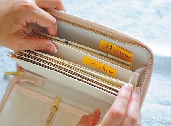 やりくり費は蛇腹ポーチに振り分け。「各ポケットに費目と金額をメモしておいて、わかりやすく。カード利用分や電子マネーのチャージ分も都度ここから出し、あといくら使えるかを必ず現金で確認します」。