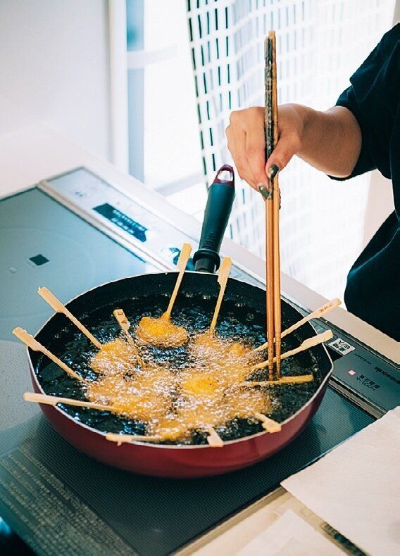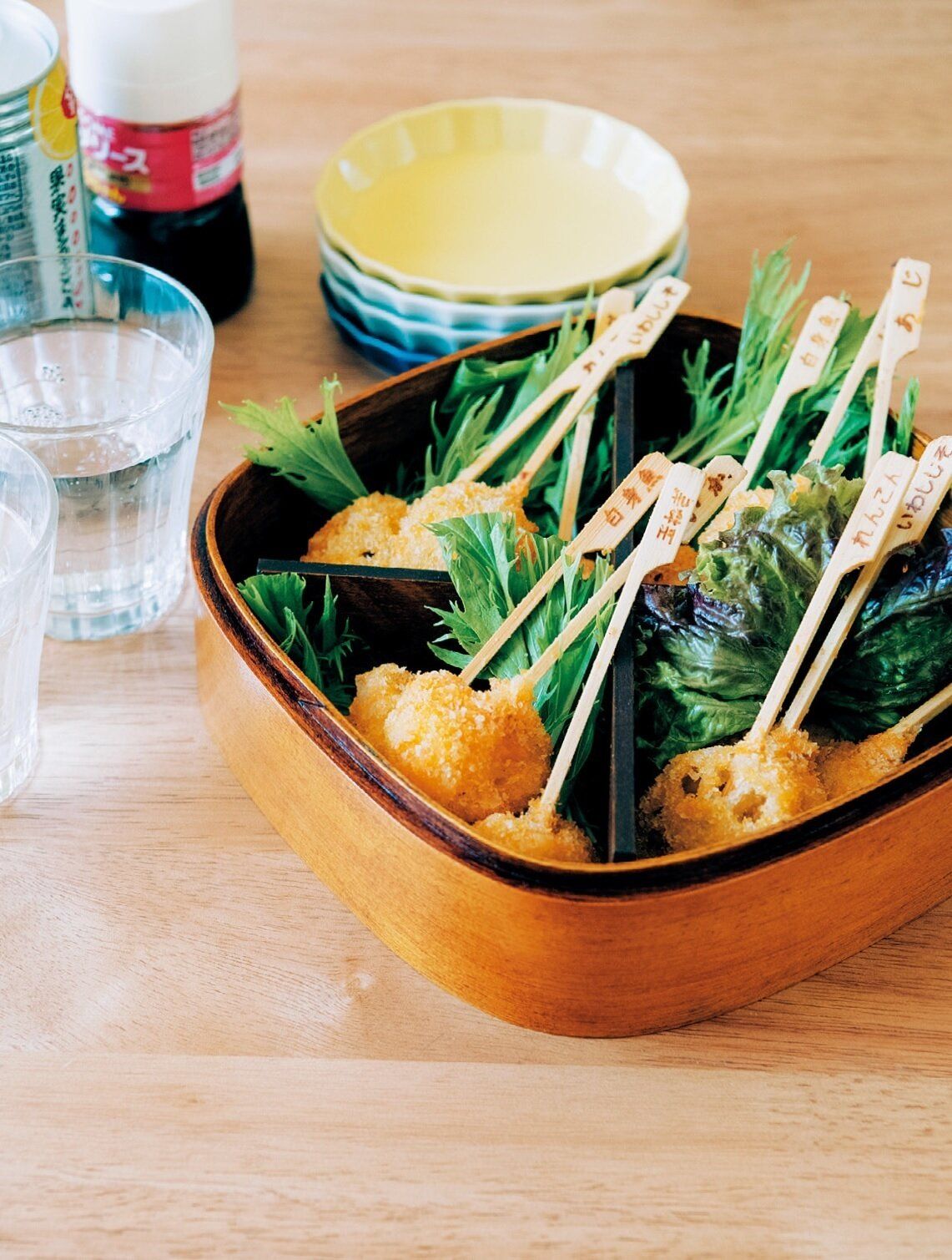 冷凍串揚げと度数高めの缶酎ハイを買ってきたら、おうちで居酒屋を超すクオリティーに。いつでも揚げたてをのんびり食べられ、コスパの良さが半端なし。「以前は月10万円以上使っていた外食と居酒屋に行くことが減りました」。盛り付けにわっぱが大活躍☆