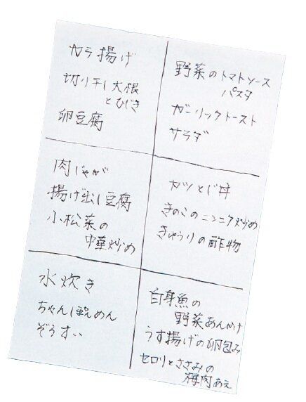 食べたい物を書き出した献立を元に買い物メモを作り、使う食材だけしか買いません。ノリで特売の野菜に飛びついて、結局使わず野菜もお金も捨てる、なんてことは絶対にありません。献立は6日分だけ考え、7日目は残り物一層デーに。