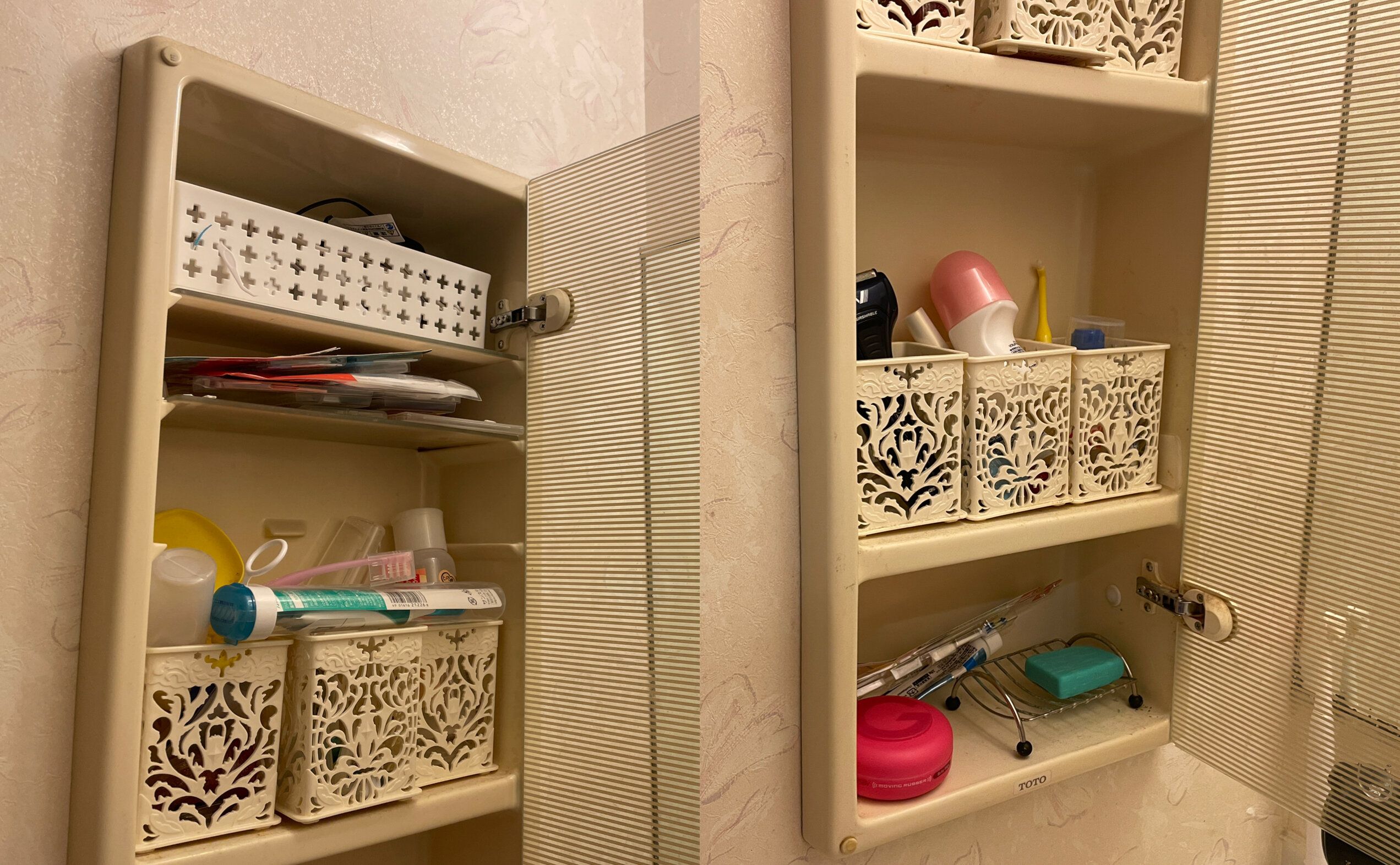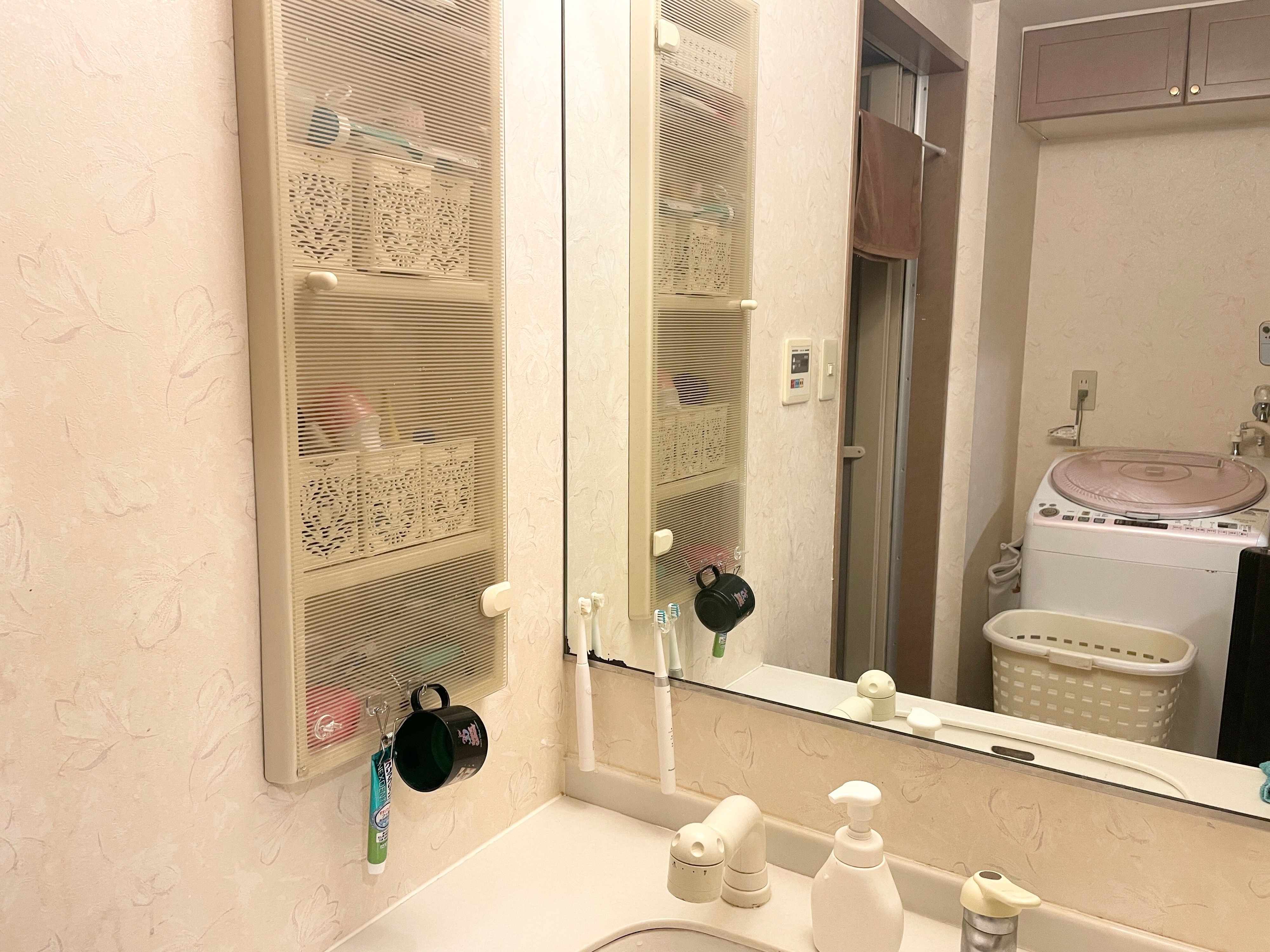 我が家の洗面台は鏡面裏収納ではなく、壁面にある半透明の扉がついた棚。ここを片づけていきますよ。