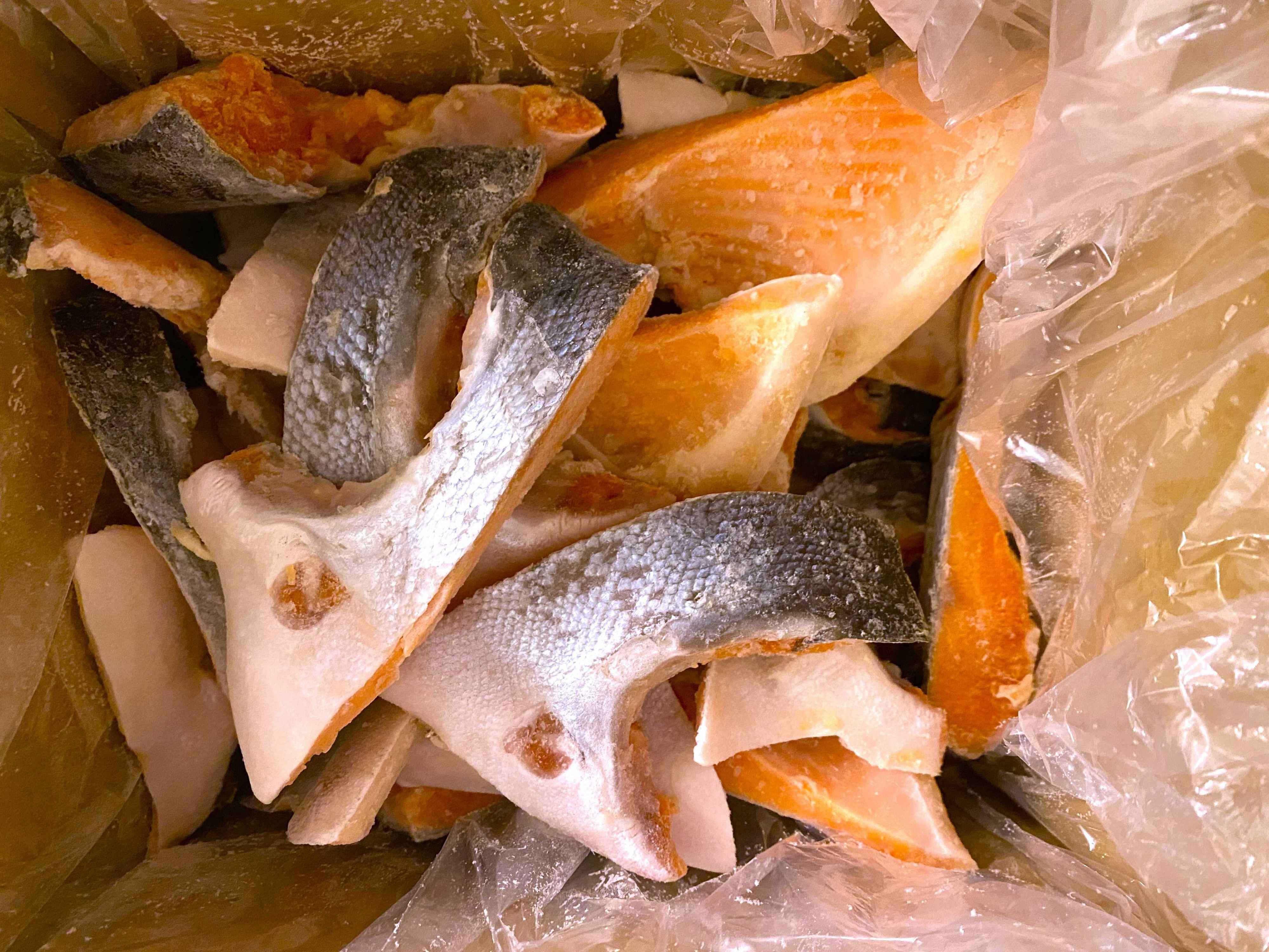 開けてみると、大・小の鮭カマがたっぷり。「さすが4kg!」大小合わせて32個の鮭カマが入っていました。サイズにばらつきがあるから訳あり品ということでしょうか?我が家では全く問題ありません。大きいのは大人用、小さいのは子ども用にしてもいいですね。小さいものは少なく、大きいものが沢山入っていました。