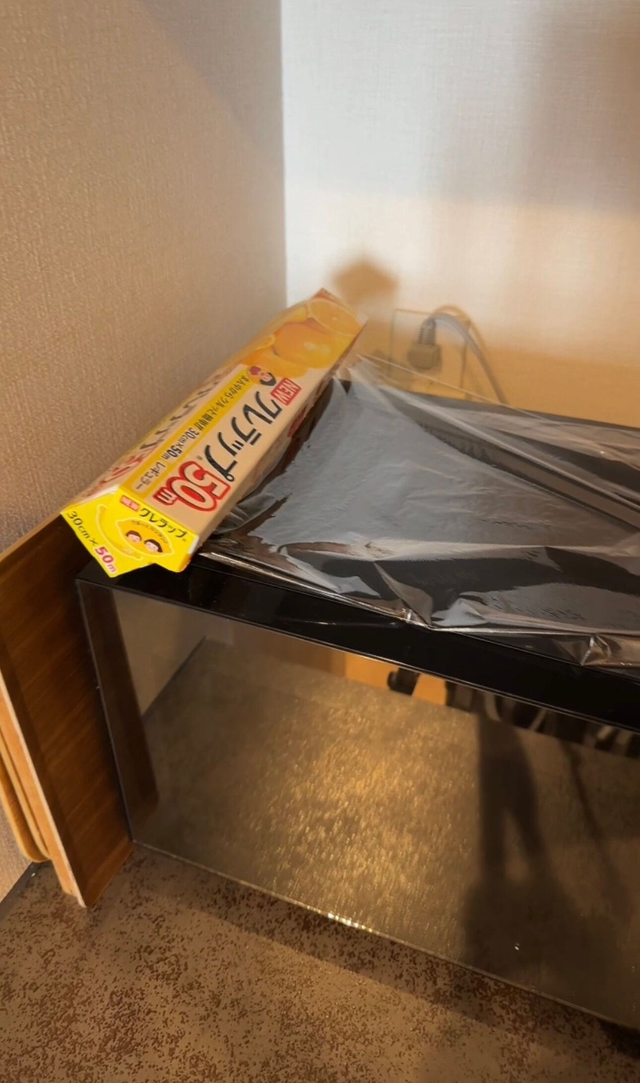 ホコリ除けにラップをかけておくと便利ですが、レンジの上はNG…。