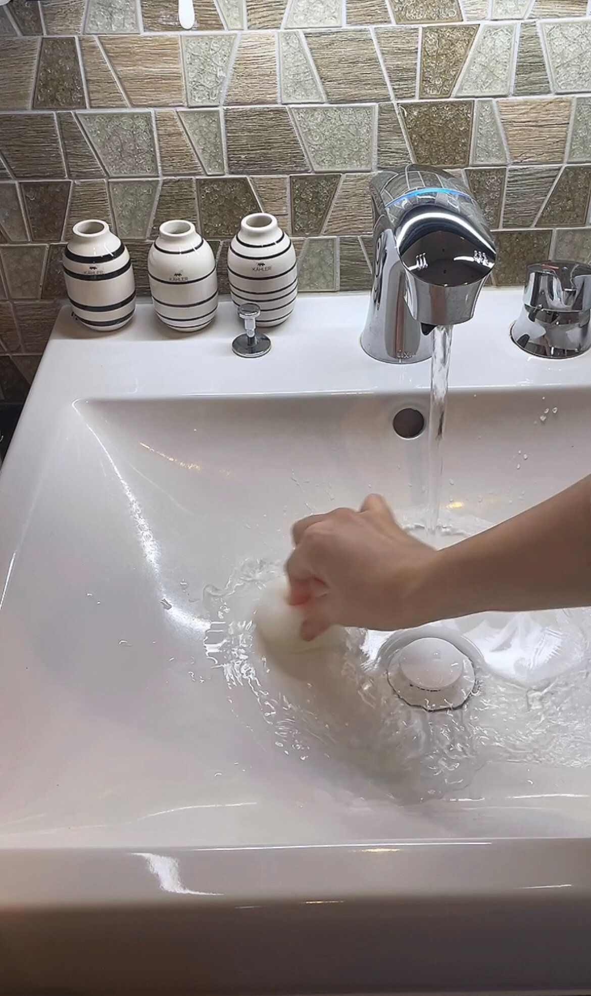 お湯になるまでのお水をかけながら、スポンジで洗面台を擦っておけば汚れも取れるし、