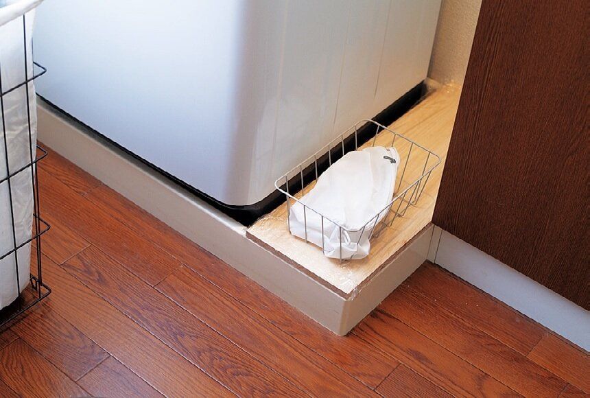 洗濯機の下にある防水パンにはホコリやゴミが侵入しがち。そこですき間をふさぐように、防水用のラップを巻いた板を上に乗せちゃいます*。ホコリがたまらず、ちょい置きスペースも生まれて一石二鳥。