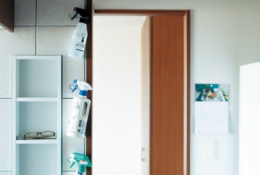 1日に何度も使うスプレー式の洗剤は、シンク横の壁の見えない位置に引っかけ収納。これならさっと手に取れます。使っているのはセリアの「何度でも貼ってはがせるフィルムリングフック」。