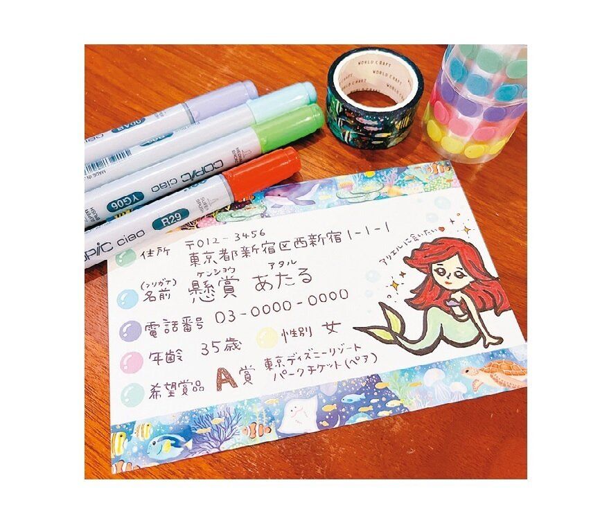 はがき応募の際は、得意なイラストでアピール。「イラストが苦手な人はスマホでスクリーンショットを撮り、画面を明るくしてはがきを上にのせればトレースできます。文字を丁寧に書くこともポイントです。当たるコツは、とにかくいろいろなキャンペーンに応募すること!に尽きますね」。