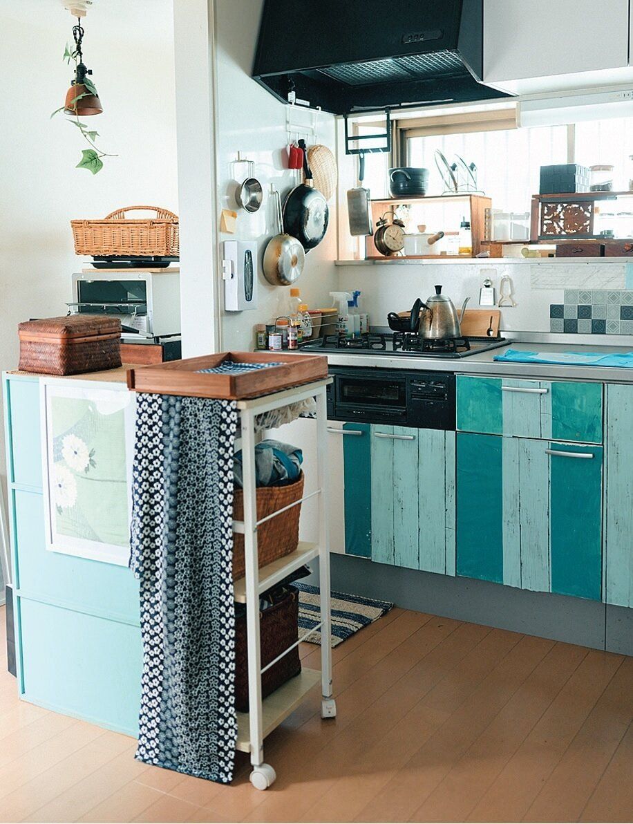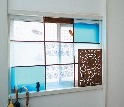 100均グッズなどを使って、少しずつ手を加えています。「キッチンの扉には壁紙シート、窓枠には端切れやクリアファイルを貼ってパッチワーク風に。自分好みのブルー系の空間になりました」。