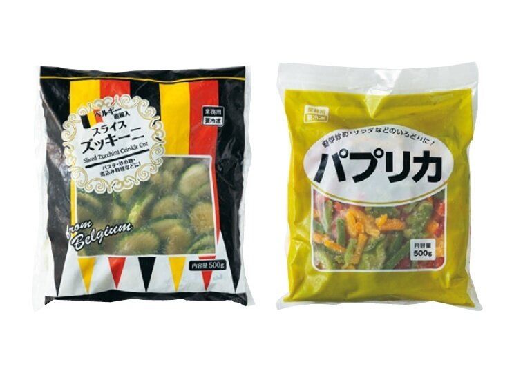 「冷凍パプリカ」は、色ごとに分けて保存すると、この色だけ使いたいとときにムダがありません。「スライスズッキーニ」は通年でお得に買えるのも便利。