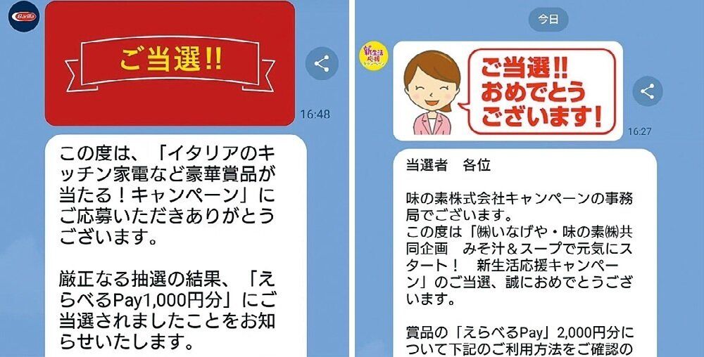 LINEアカウントから応募できる懸賞は手軽。友だち登録する懸賞や対象商品のレシートを送る懸賞、アンケートやクイズに回答する懸賞などさまざま。「えらべるPay」(QRコード決済やギフトコードが選べる)での付与も多いです。