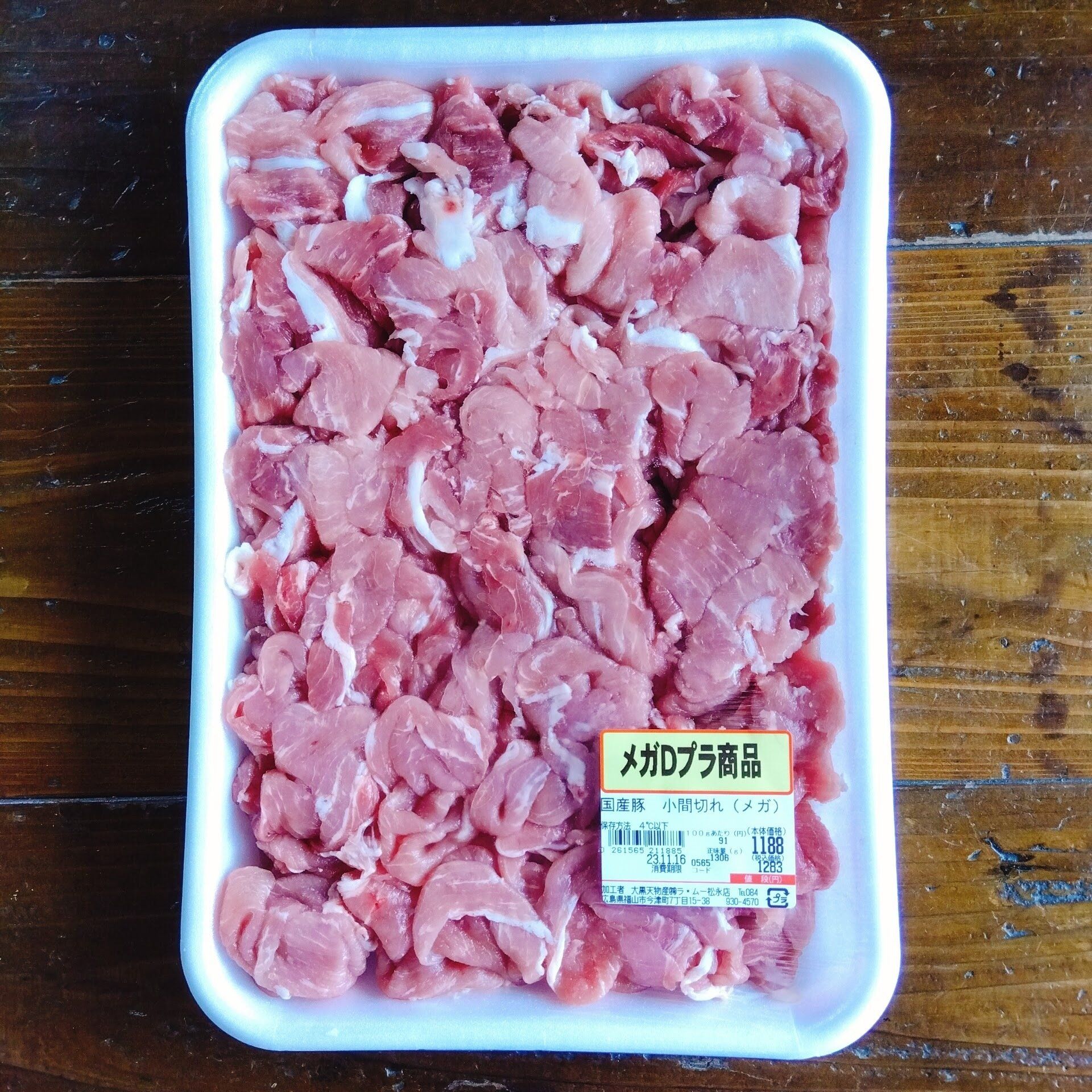 国産豚小間切れ100g「98円」