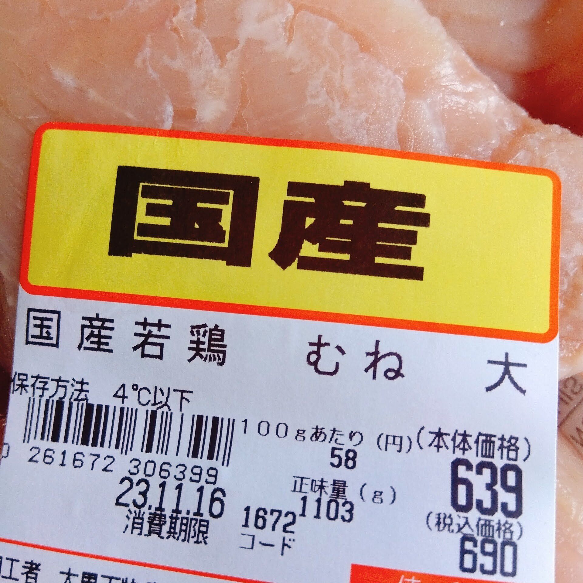 国産鶏むね肉100g「62円」