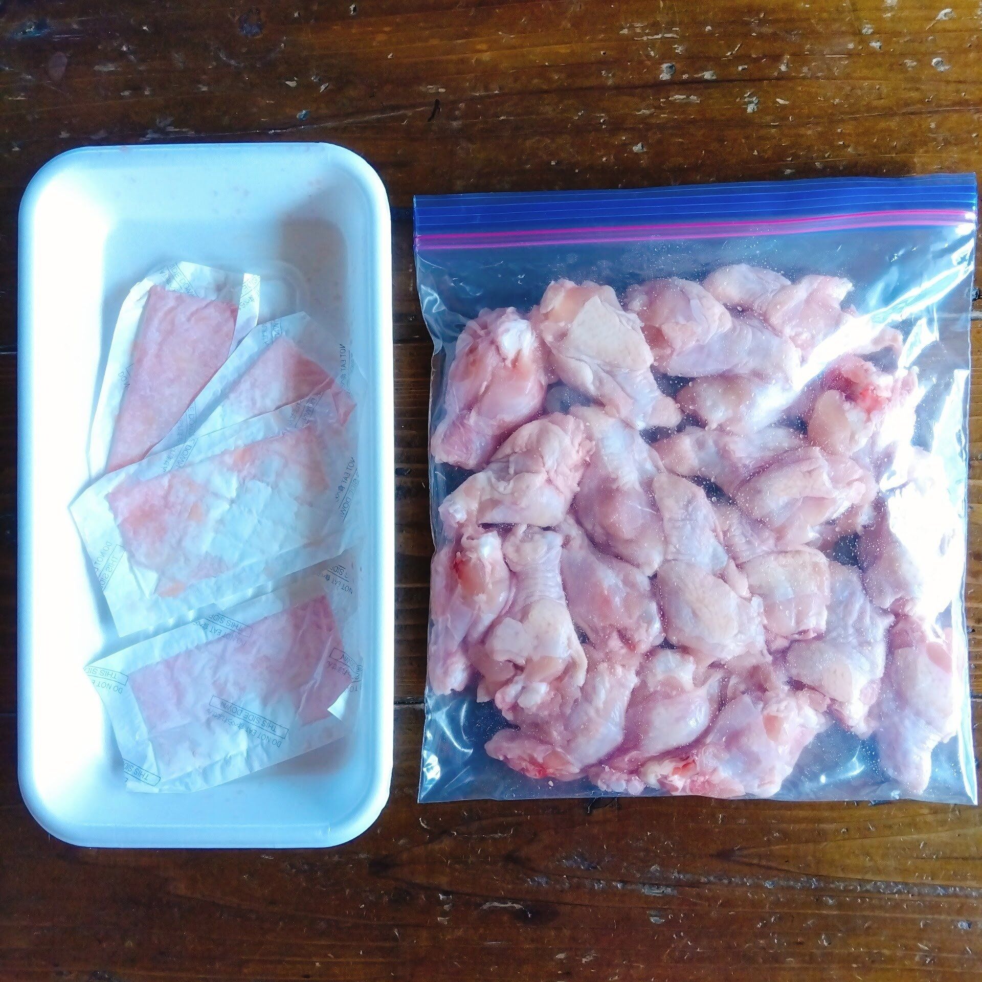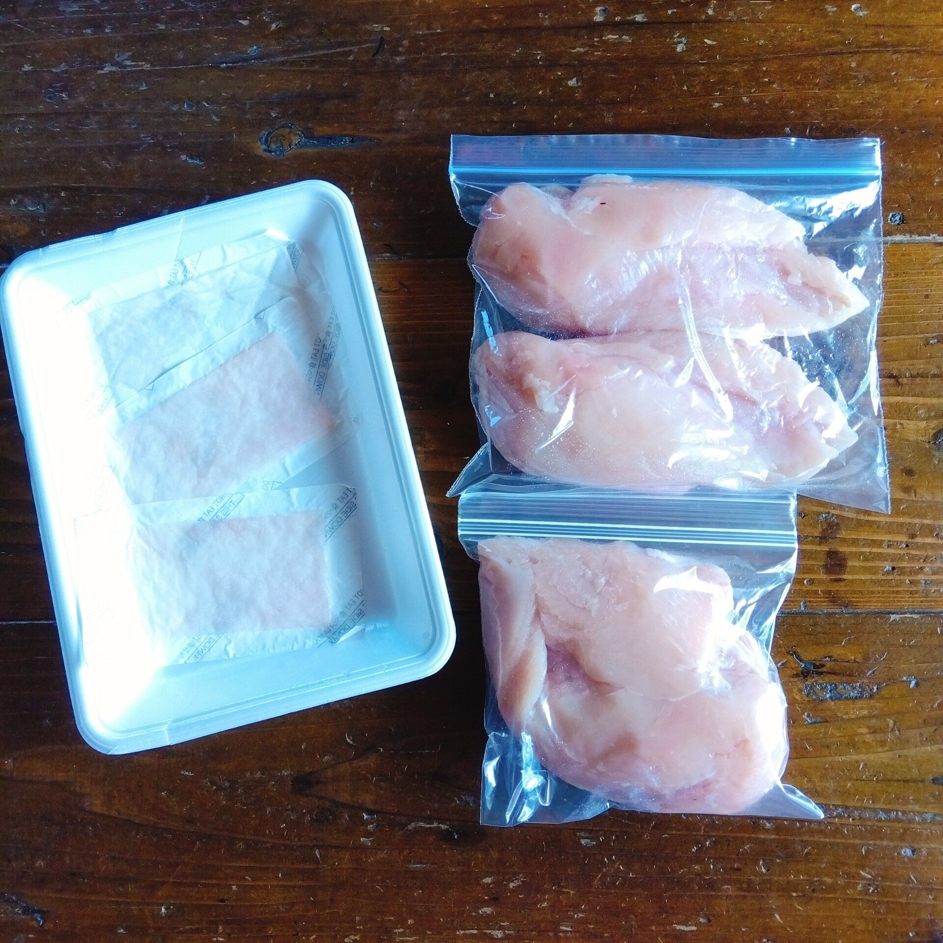 むね肉は、1枚より2枚、2枚より3枚入りの方が、100gあたりの金額が安く設定されているスーパーが多いので、なるべく数が多く入っているものを選んでいます。