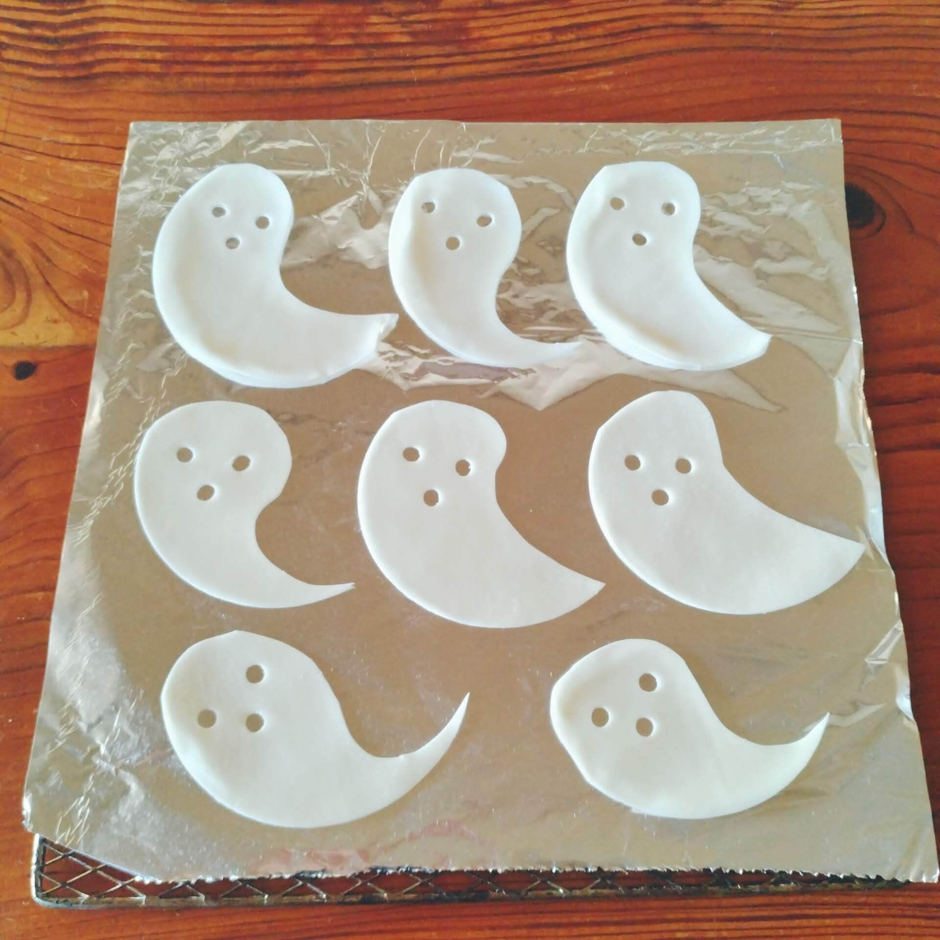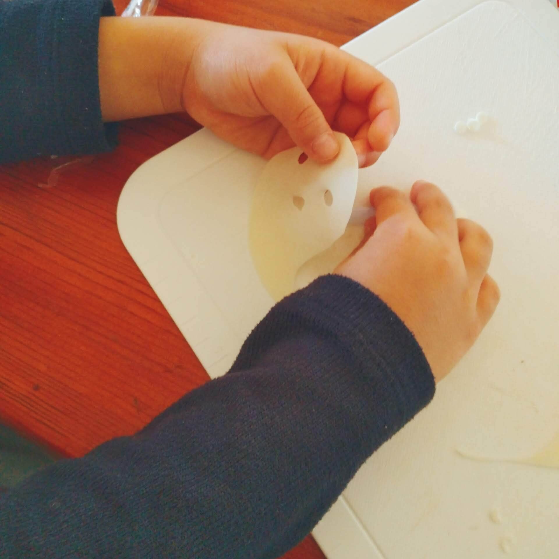 ハロウィンモチーフのオバケは、食用のはさみで形を切りだしストローで目と口の穴を開けました。餃子の皮が薄いわりに丈夫なので、5歳の息子でも上手につくれました。