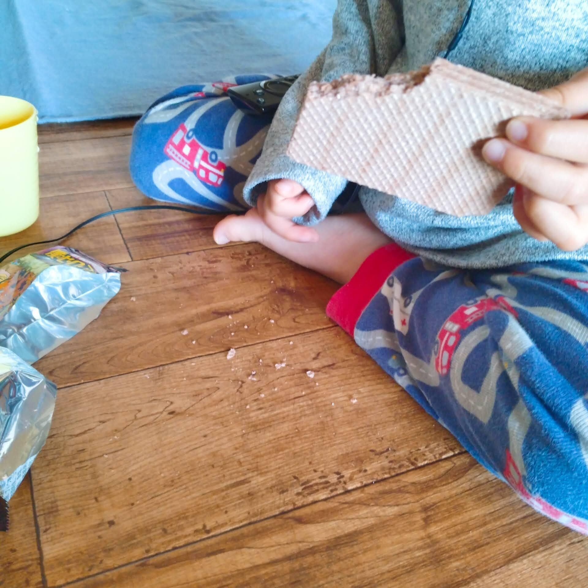 「こんなハズじゃなかったのに」と思いつつ、よくよく観察すると、そもそもお菓子を食べる時にラグに座っていない息子。なるほど、完全にわたしの計算違いです。