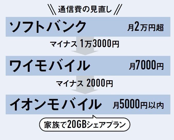 なんとなく大手キャリアと契約していた通信費を見直し。大手キャリアのサブブランドに変更後、さらにコストダウン。「必要なギガ数が確保できて、なおかつ料金が一番安いプランを選びました」。