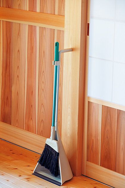 床掃除はホコリやゴミに気付いた所をホウキでササッと済ませます。「掃除機を出したりしまったりするよりラク。子育てに手がかかる今は、掃除は無理のない範囲でやってます」。