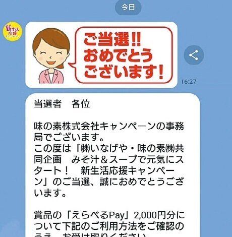 LINEアカウントから応募できる懸賞は手軽で、よく当たります。友だち登録する懸賞や対象商品のレシートを送る懸賞、アンケートに回答する懸賞などさまざま。「えらべるPay」(希望のQRコード決済などを選べる)での付与が多いのも特徴です。