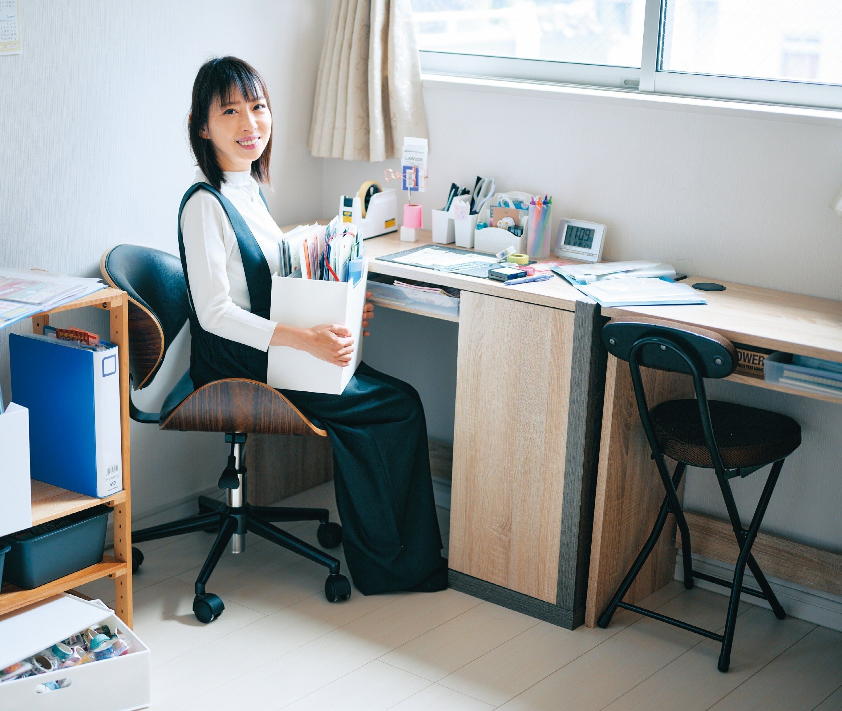 ふだん机の上には何も置かず、作業のときだけ出すように。「はがきと作業中の物は天板下の一等地に。文具、デコアイテムはそれぞれ箱に入れ、座ったらすぐ作業スタート(笑)」。
