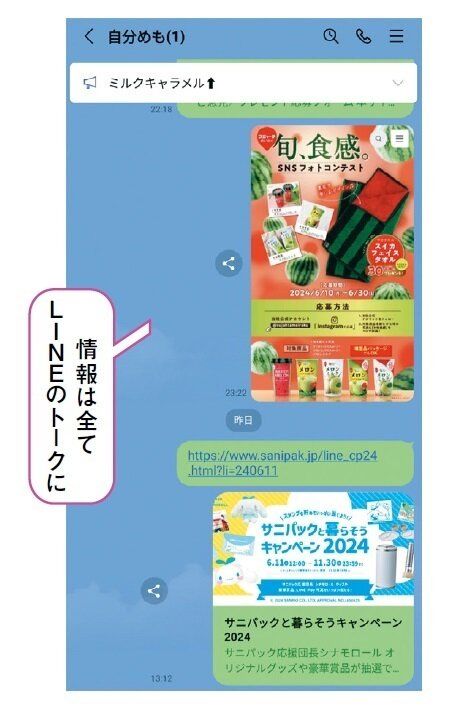 応募URLをはじめ、フォトコンテスト用の写真、レシートなど全てLINEのトークに集約。「アナウンス機能を使って、途中まで作業しているブランドを忘れないように管理」。