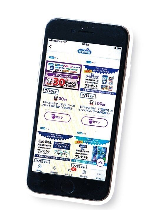 ウエルシアのアプリ、キャッシュレス決済のアプリでキャンペーンを確認。「ウエル活の日に、ポイント還元の特典を組み合わせるとさらにお得に。実質0円になることもあるので見逃せません」。