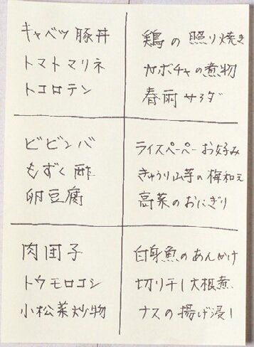 メモ帳を6分割し、6日分の主菜と副菜を記入。時間がない日に時間がかかる献立だと大変なので、あえて何曜日に何を作るかは決めず、その日の時間の余裕度で決定しています。