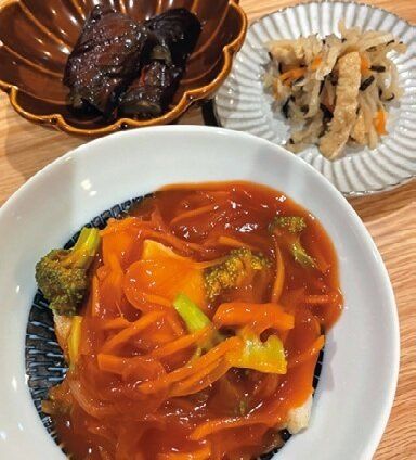 たんぱくな白身魚はあんかけでボリューミーに。なすの揚げびたしはオーブン調理で油を節約。