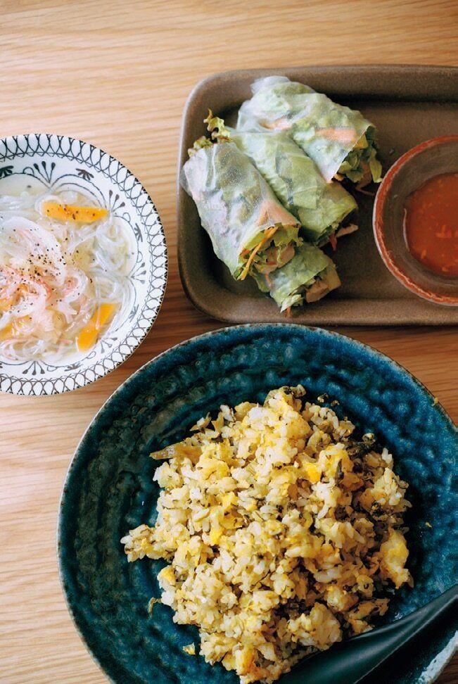 炒飯とスープで半端に残った食材を一掃。金曜のお好み焼きの残りのライスペーパーで作った生春巻きにも、残った肉や野菜を投入。