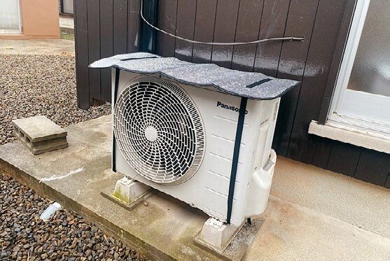 室外機本体が高温になると、冷房の効きが悪くなり電力消費量が増える原因に。日よけカバーをのせて、バンドで留めるだけで対策できます☆