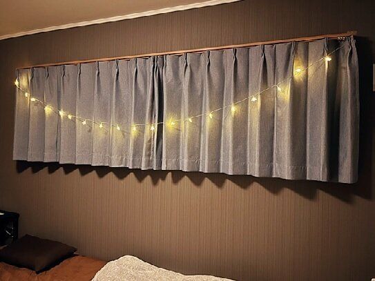 夜、寝るまでの時間は、カーテンレールに取り付けた300円のLEDのガーランドライトをON。照明代を節約できるし、気持ちよく眠りにつけるのでお気に入り。