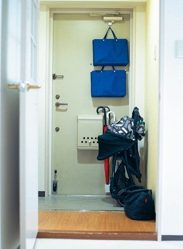 リビングに物が集まらないよう、収納はゼロ。バッグ類は玄関に