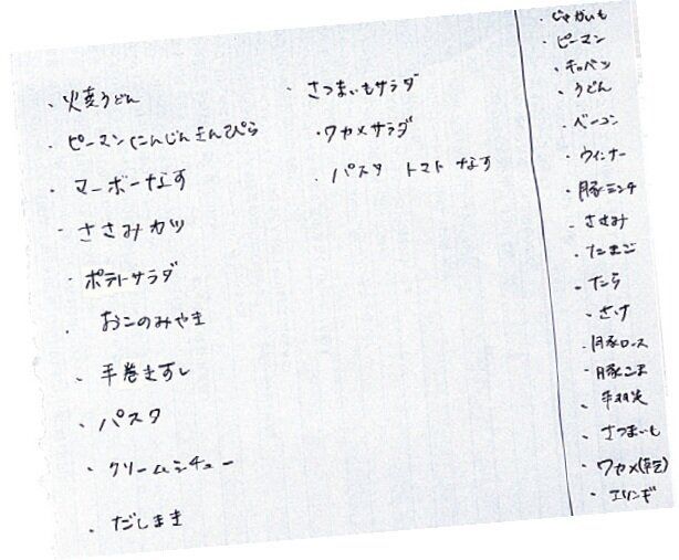 今ある食材と、それで作れるメニューをざっと書き出します。毎日この中から選ぶだけなので在庫管理の手間と献立作りの悩みが解消でき、外食も激減!