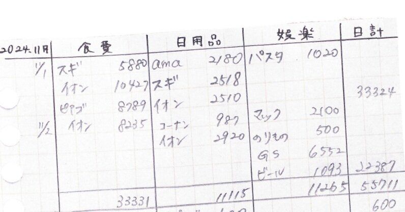 食費、日用品費、娯楽費はトータルで月12万円以内ならOKとゆる管理。気が向いたタイミングで家計簿に3項目の合計額を書けば、今月の残金がパッとわかり、使えるお金も明確に。