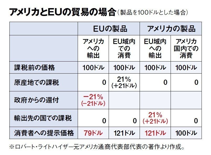 【岩】例えばアメリカとEUの貿易の場合、21%のVATがあるEU製品とVATがないアメリカ製品を消費者が購入する際に価格の差が生じます(上表参照)。どちらの製品も100ドルとすると、輸出還付金を受けることでEU製品はアメリカ国内で79ドルまで値下げすることが可能に。