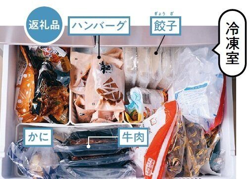 庫内にはふるさと納税の返礼品がぎっしり。「投資より、まずは節税の意識を持つのが大事!」と八木さん。寄付額が住民税から控除され、さらに食卓も豊かに。