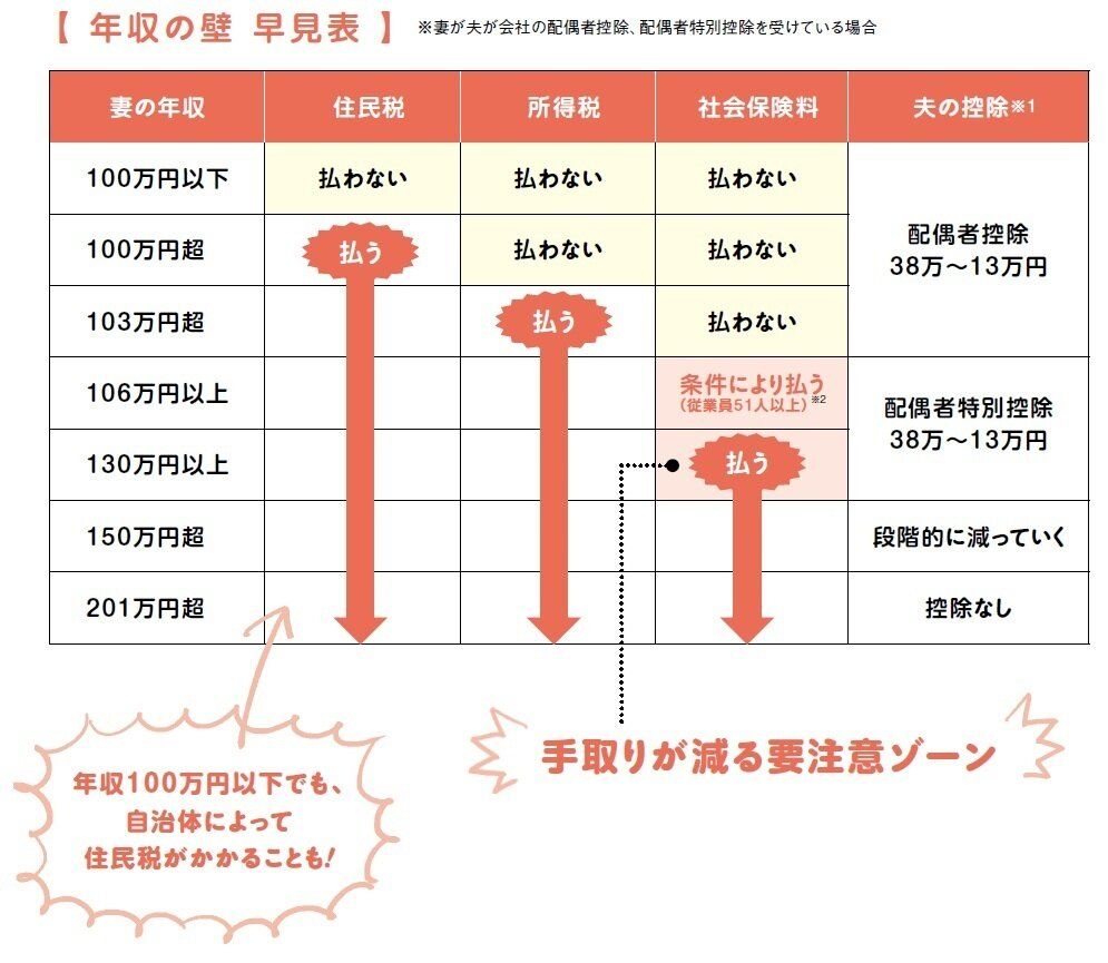 今何かと話題になっている「年収の壁」ですが、現時点(24年12月)での税制では、年収100万円超で住民税がかかり、年収103万円超で所得税がかかります。夫が会社の配偶者控除を受ける場合は妻の年収103万円まで、妻の年収106万円以上で配偶者特別控除となり、年収150万円超で配偶者特別控除の額は段階的に減っていき、年収201万円超で控除の対象外になります。