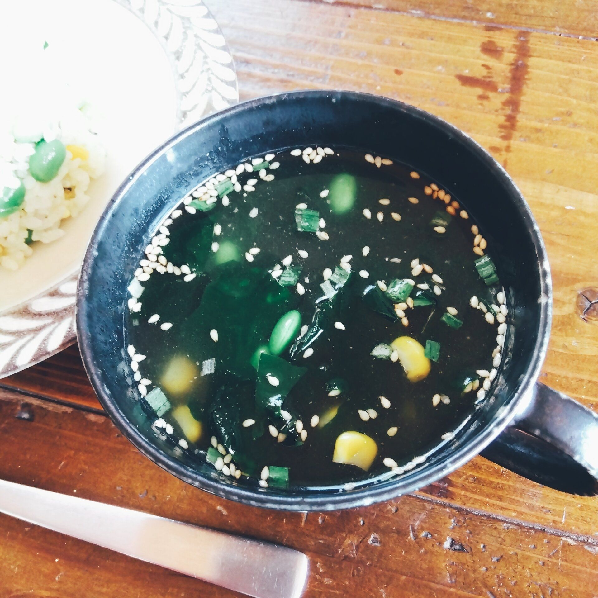 手軽でおいしいインスタントスープに、冷凍のむき枝豆とコーンを足せば「しっかり噛んで食べられるスープ」のできあがり。枝豆とコーンを入れることで彩りもよくなります。