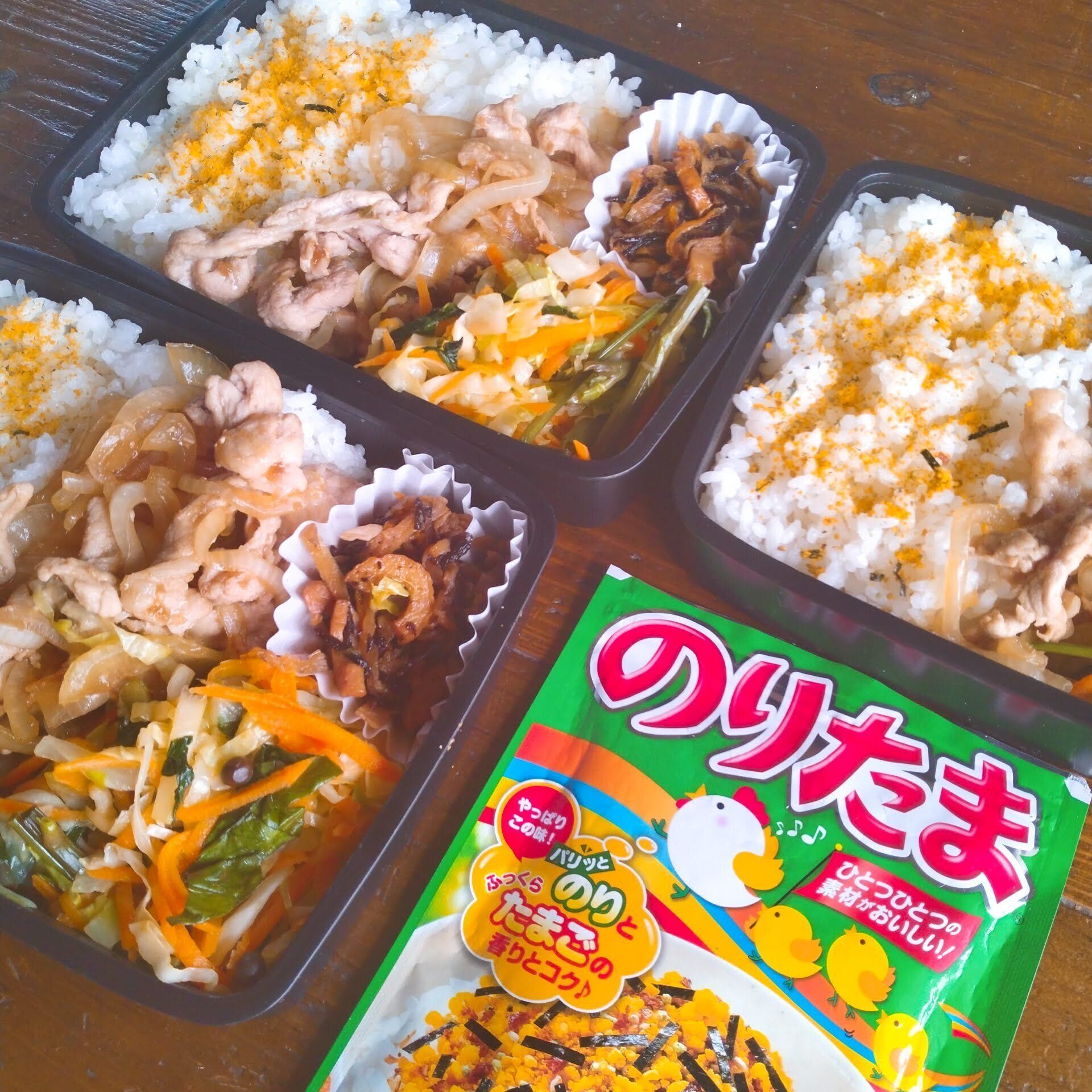 冷蔵庫の残り物や、夕飯のおかずをお弁当にスライドする関係上、ときにはお弁当が茶色一色になることも。そんな時には「ふりかけ」で彩りを足しています。