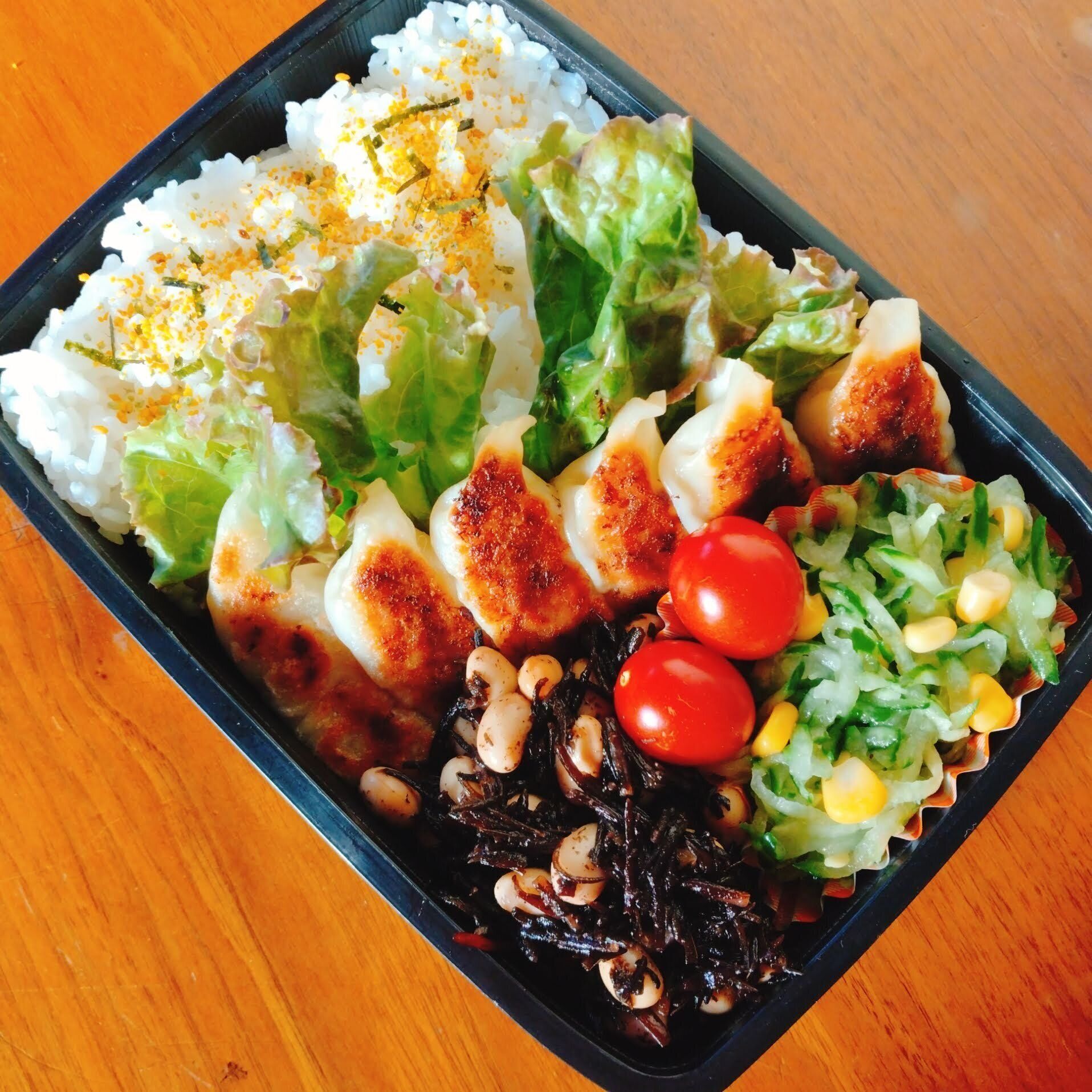 きゅうりや白菜とサラダにしてもいいし、コーンだけおかずカップに入れてもいい。大事なのは、「彩り」と「お弁当を用意した事実」だと思っています。
