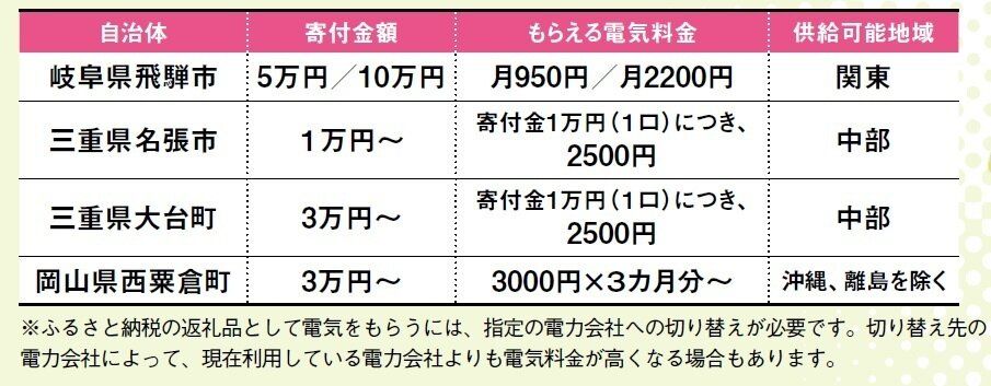 電気料金の高騰で注目されているのが、電力の返礼品。「太陽光発電や小水力発電など、自治体の地域内で発電された再生可能エネルギーに限定され、指定の電力会社との契約が必要などの条件がありますが、切り替え予定がある人は利用してみてもいいでしょう」。
