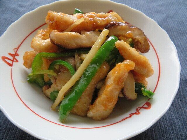 酢鶏の時と同じく下味をつけ片栗粉をまぶして揚げておき、細く切った他の材料と炒め合わせるだけ。