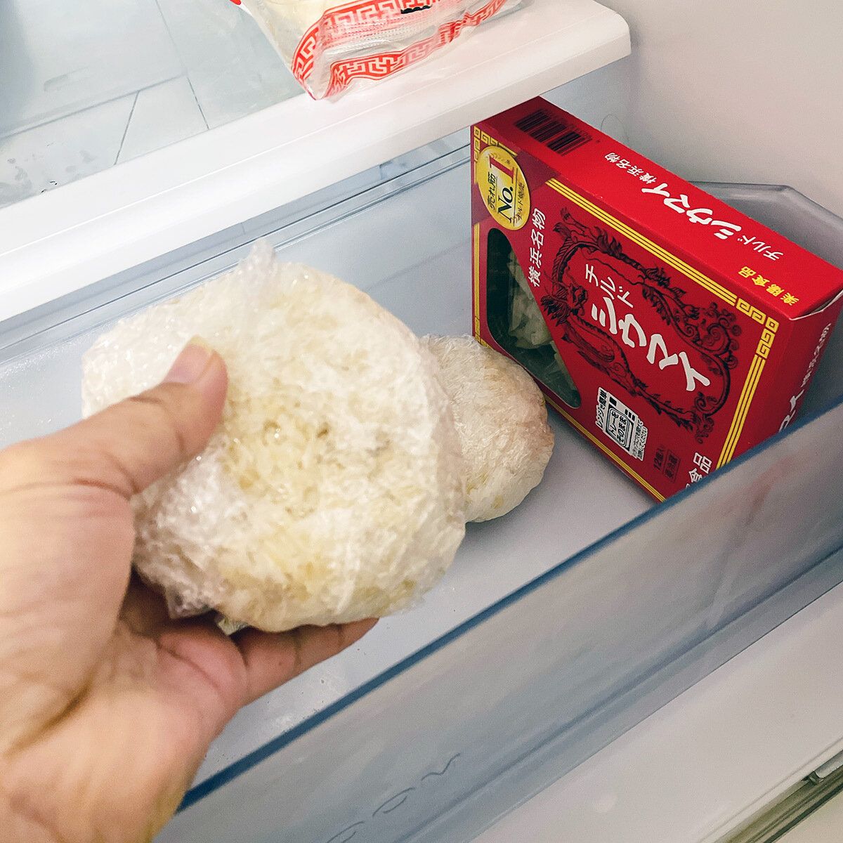 お茶碗1膳分ずつラップにくるんで冷蔵庫へ。