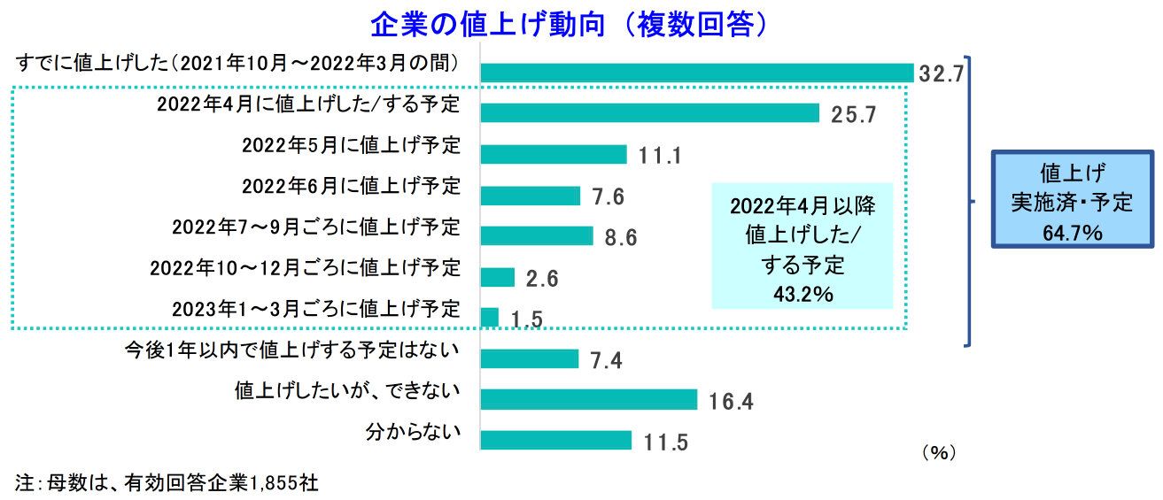帝国データバンクが2022年4月8日に発表した「企業の今後1年の値上げに関する動向アンケート」の結果によると、主要な製品・商品や商材、サービスの分野で、32.7%の企業が「2021年10月~2022年3月の間にすでに値上げした」と回答しています(※1)。