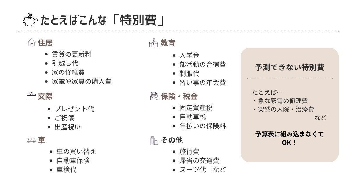 特別費とは、1年のうちのどこかで支払うことが予想される支出のこと。たとえば固定資産税などの税金、サブスクリプションの年会費、帰省や旅行の費用、子どもの入学金や部活の合宿費用などが、特別費にあたります。