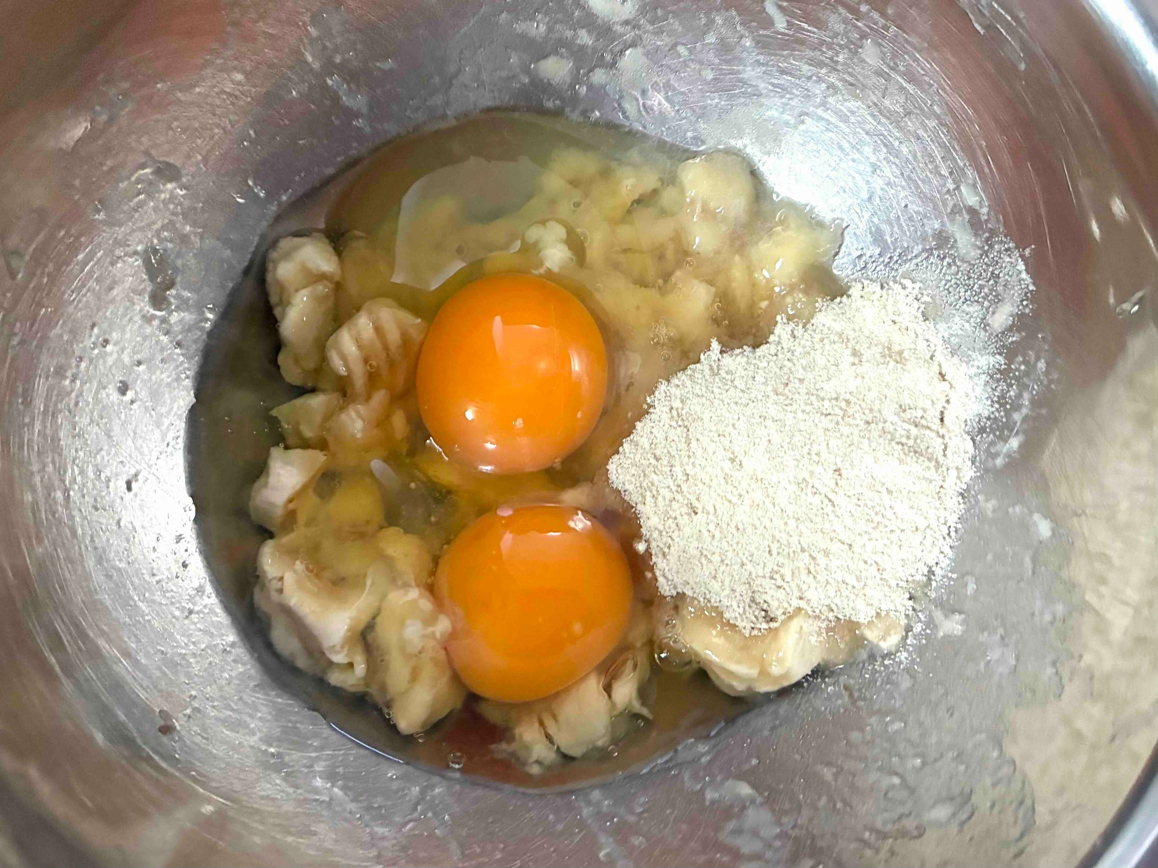 バナナはフォークで粗くつぶすのがコツ。焼き上がった後に、バナナの存在感を感じられますよ。
