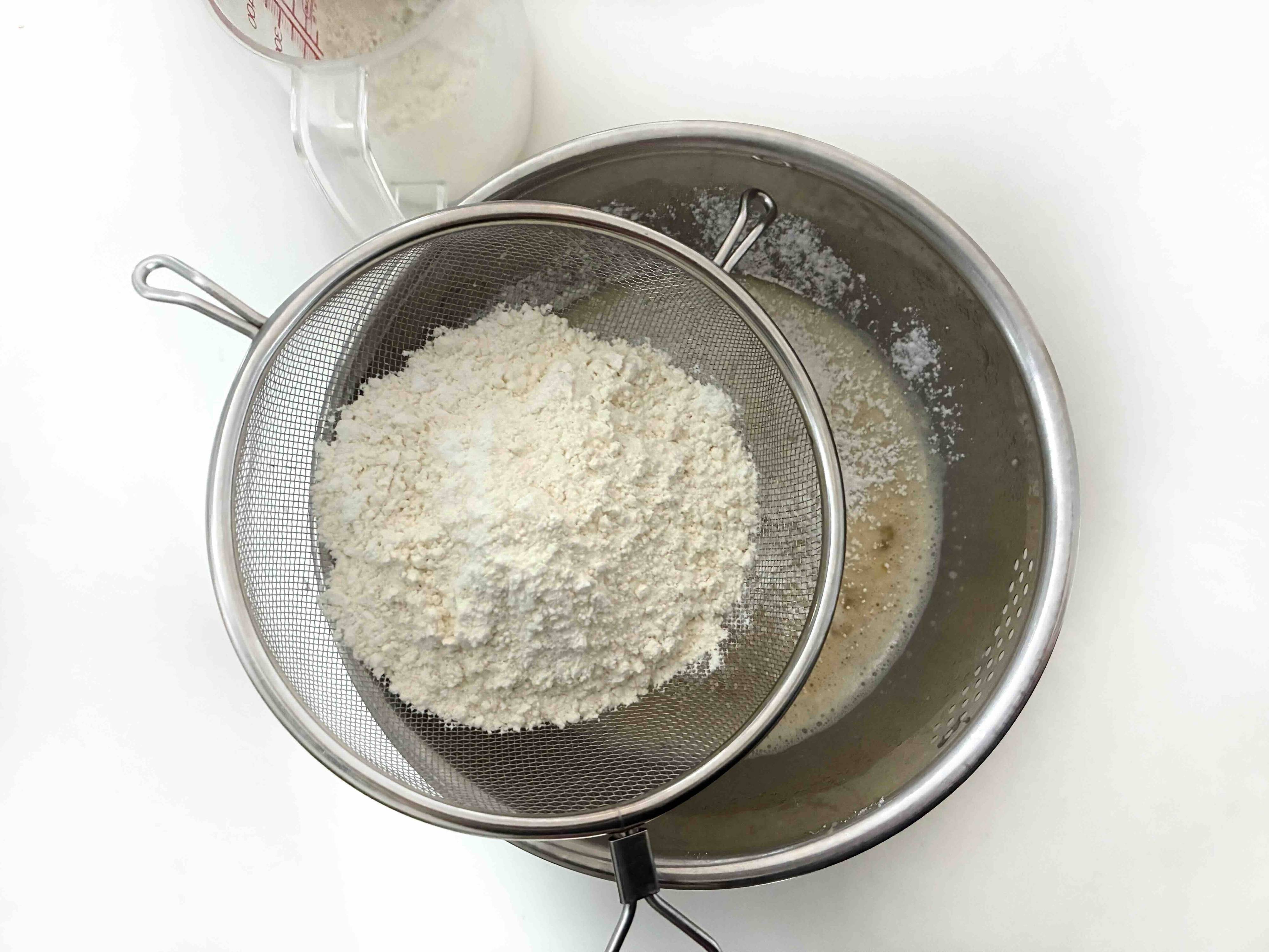 まとめてざるで振るいます。面倒ですが、ここだけはちゃんと振るっておきましょう。ダマをなくし、(3)と合わせる際に混ぜる回数を減らすためです。