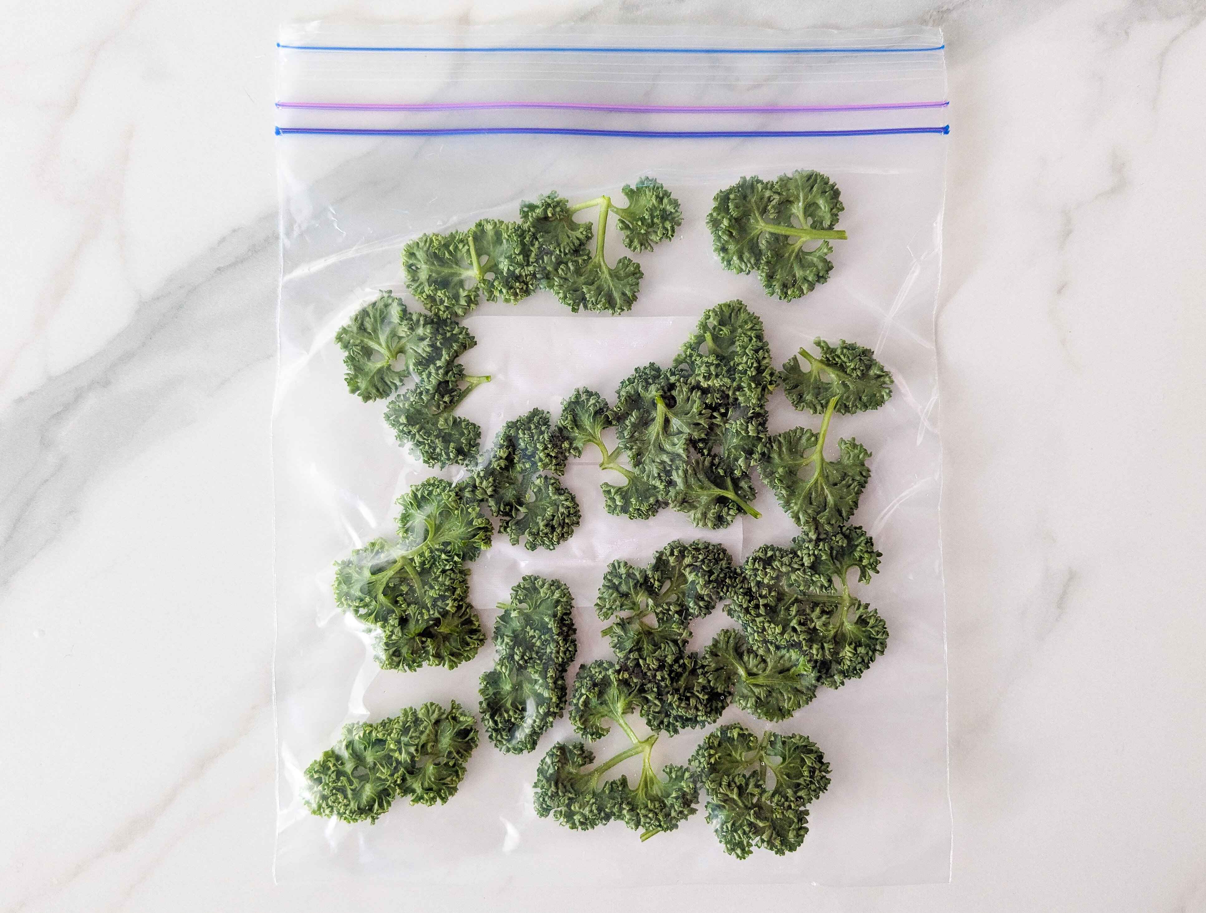 3.冷凍用のジッパー付保存袋に、葉を重ならないように入れ空気を抜きながら閉じます。